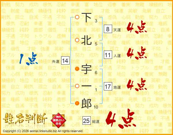 下(3画)北(5画) 宇(6画)一(1画)郎(10画)