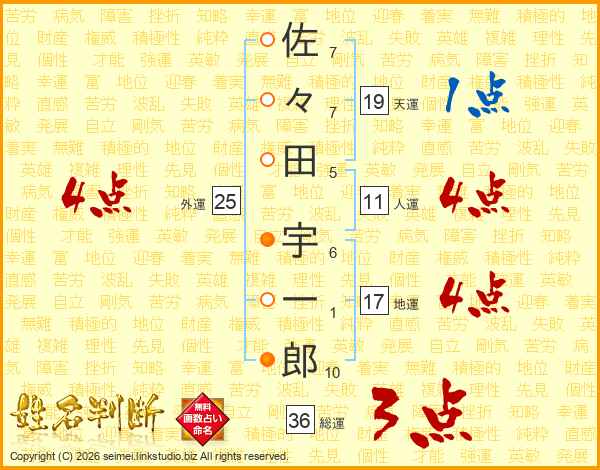 佐(7画)々(7画)田(5画) 宇(6画)一(1画)郎(10画)