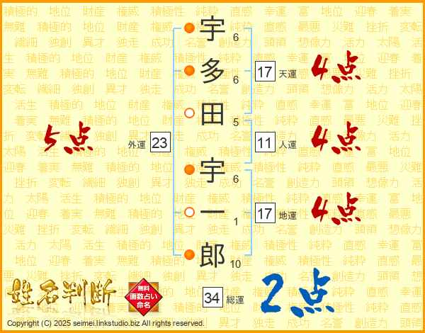 宇(6画)多(6画)田(5画) 宇(6画)一(1画)郎(10画)