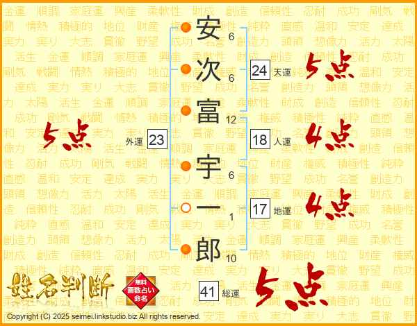 安(6画)次(6画)富(12画) 宇(6画)一(1画)郎(10画)