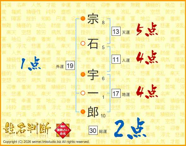 宗石宇一郎さんの総運は30画の2点!