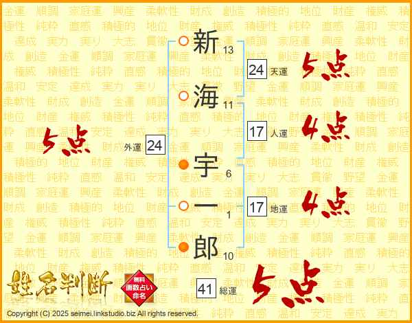 新(13画)海(11画) 宇(6画)一(1画)郎(10画)