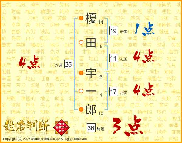 榎(14画)田(5画) 宇(6画)一(1画)郎(10画)
