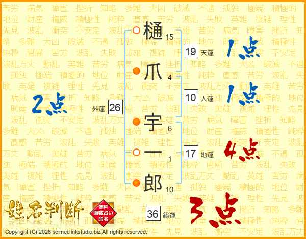 樋(15画)爪(4画) 宇(6画)一(1画)郎(10画)