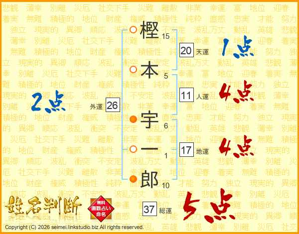 樫本宇一郎さんの総運は37画の5点!