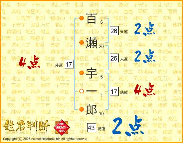 百(6画)瀬(20画) 宇(6画)一(1画)郎(10画)