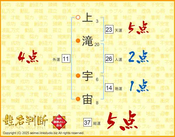 上(3画)滝(20画) 宇(6画)宙(8画)