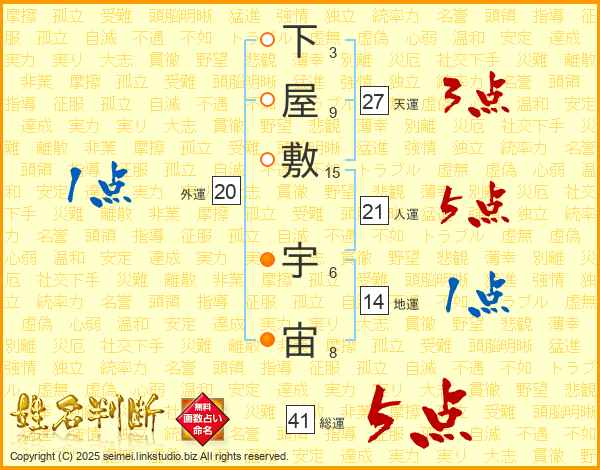 下(3画)屋(9画)敷(15画) 宇(6画)宙(8画)