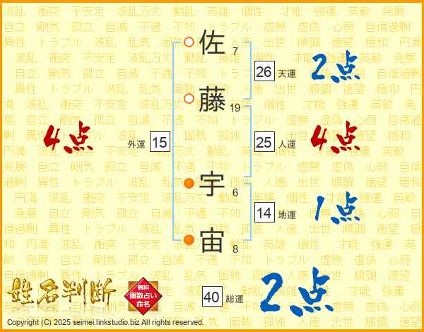 佐(7画)藤(19画) 宇(6画)宙(8画)