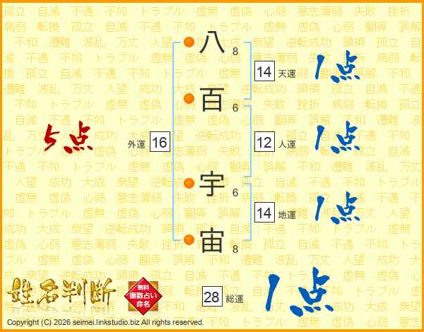 生活面を象徴する運勢です。外部から受ける影響力を表し、結婚運、家庭運や職場、環境への順応性を表します。総運から人運を引いた画数。姓や名が1文字の場合を除く。