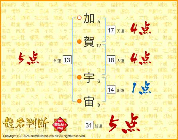 加賀宇宙さんの総運は31画の5点!