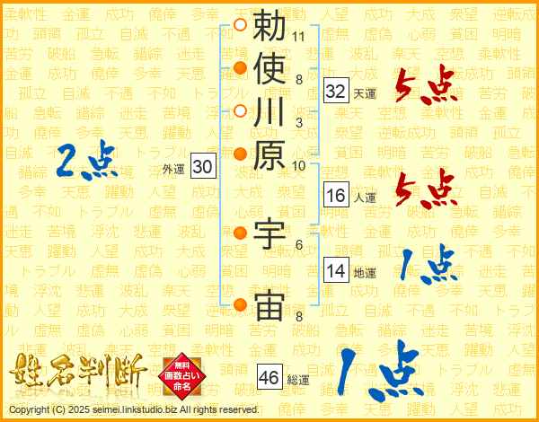 勅(11画)使(8画)川(3画)原(10画) 宇(6画)宙(8画)