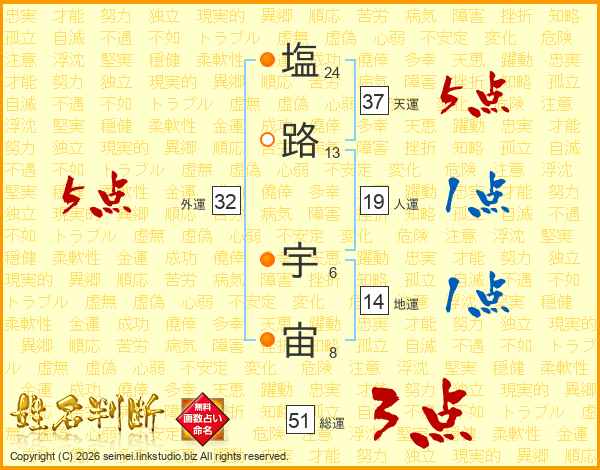 塩路宇宙さんの総運は51画の3点!