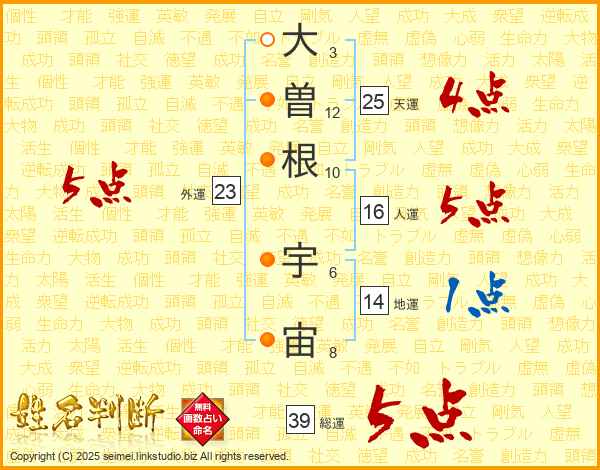 大曽根宇宙さんの総運は39画の5点!
