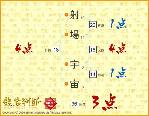 生活面を象徴する運勢です。外部から受ける影響力を表し、結婚運、家庭運や職場、環境への順応性を表します。総運から人運を引いた画数。姓や名が1文字の場合を除く。