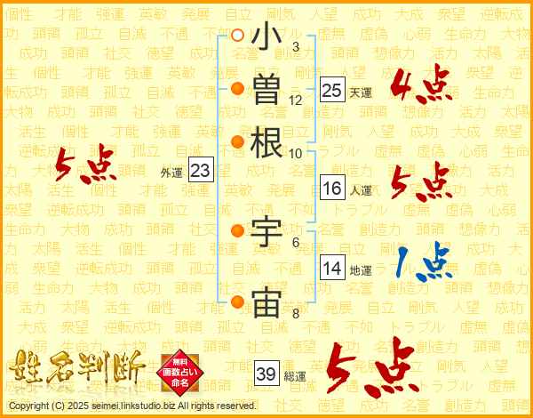 小曽根宇宙さんの総運は39画の5点!