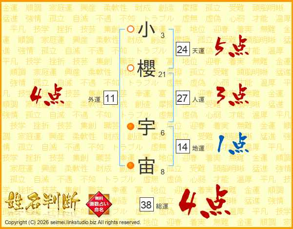 小(3画)櫻(21画) 宇(6画)宙(8画)