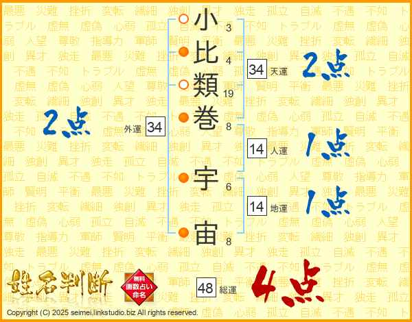小(3画)比(4画)類(19画)巻(8画) 宇(6画)宙(8画)