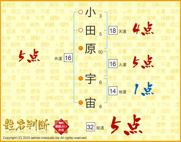 小(3画)田(5画)原(10画) 宇(6画)宙(8画)