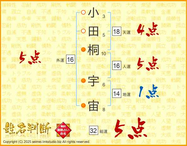 小(3画)田(5画)桐(10画) 宇(6画)宙(8画)