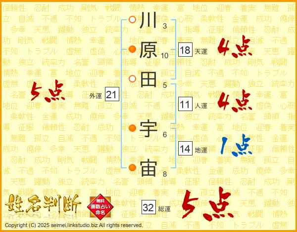 生活面を象徴する運勢です。外部から受ける影響力を表し、結婚運、家庭運や職場、環境への順応性を表します。総運から人運を引いた画数。姓や名が1文字の場合を除く。