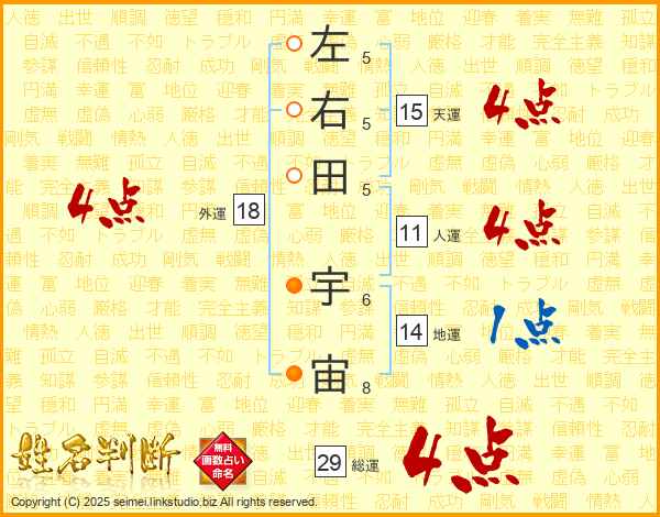生活面を象徴する運勢です。外部から受ける影響力を表し、結婚運、家庭運や職場、環境への順応性を表します。総運から人運を引いた画数。姓や名が1文字の場合を除く。
