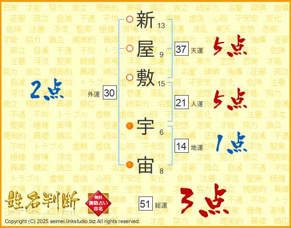 新(13画)屋(9画)敷(15画) 宇(6画)宙(8画)