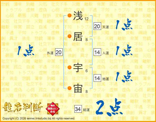 浅(12画)居(8画) 宇(6画)宙(8画)