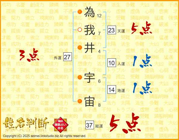 為(12画)我(7画)井(4画) 宇(6画)宙(8画)