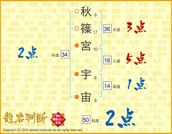 秋(9画)篠(17画)宮(10画) 宇(6画)宙(8画)