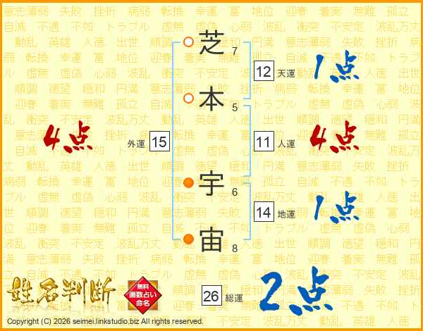 芝本宇宙さんの総運は26画の2点!