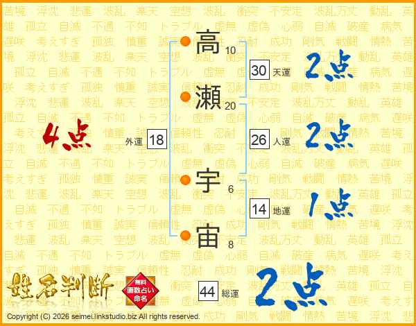 高(10画)瀬(20画) 宇(6画)宙(8画)