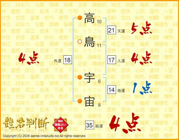 高鳥宇宙さんの総運は35画の4点!