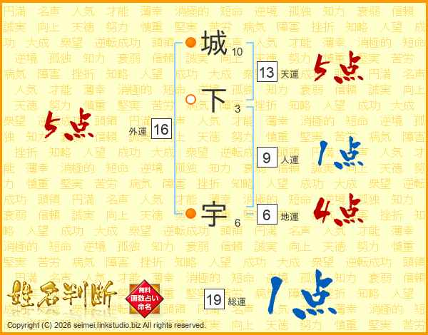 生活面を象徴する運勢です。外部から受ける影響力を表し、結婚運、家庭運や職場、環境への順応性を表します。総運から人運を引いた画数。姓や名が1文字の場合を除く。