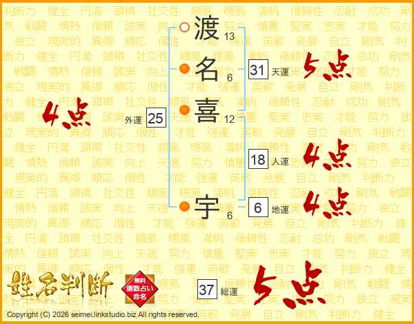 渡(13画)名(6画)喜(12画) 宇(6画)