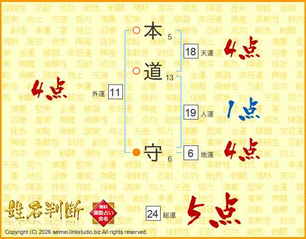 あなたの人生を表す1番重要な運勢です。生涯を通じて影響する総合運となり、主に50歳以降の晩年期に影響を及ぼします。苗字と名前の合計画数。