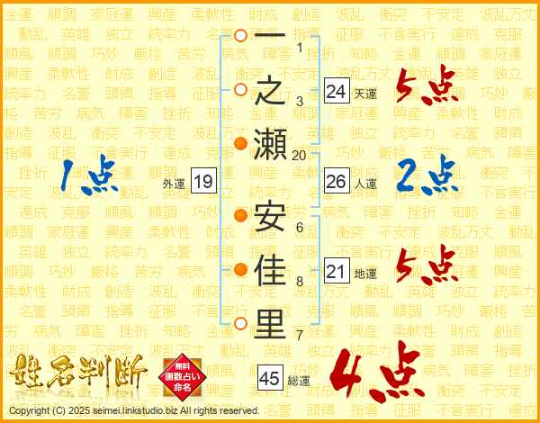 一(1画)之(3画)瀬(20画) 安(6画)佳(8画)里(7画)