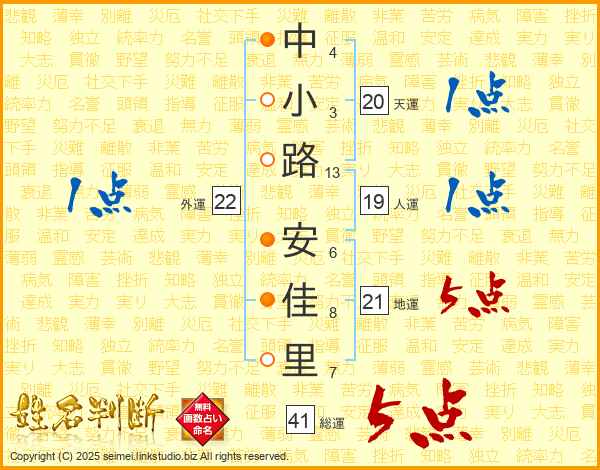 中(4画)小(3画)路(13画) 安(6画)佳(8画)里(7画)