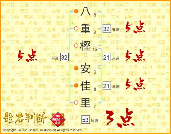 八(8画)重(9画)樫(15画) 安(6画)佳(8画)里(7画)