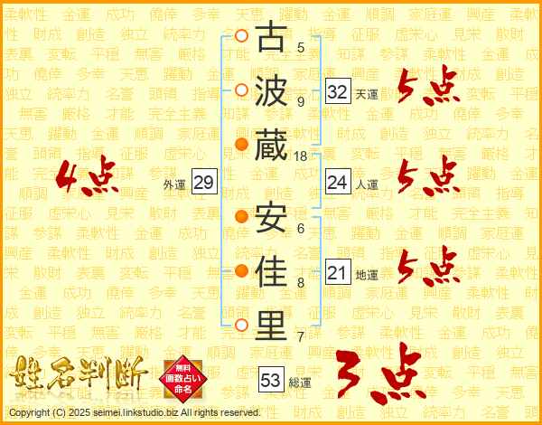 古(5画)波(9画)蔵(18画) 安(6画)佳(8画)里(7画)