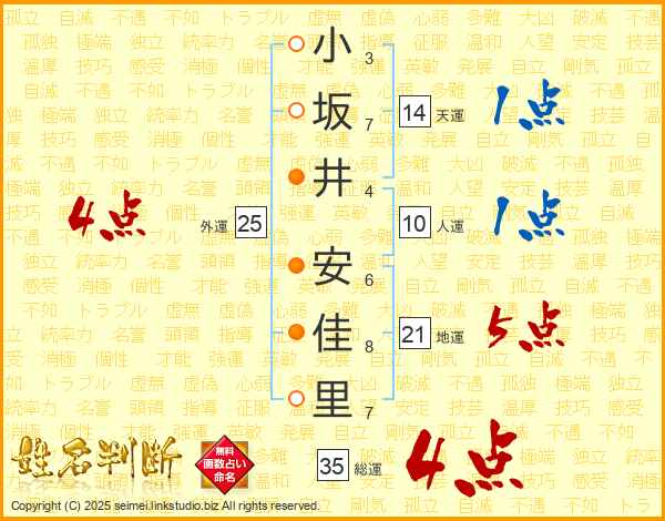 小(3画)坂(7画)井(4画) 安(6画)佳(8画)里(7画)