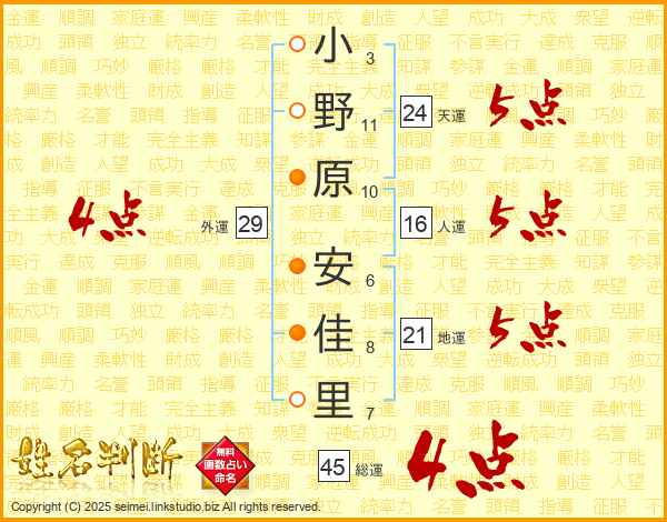 小(3画)野(11画)原(10画) 安(6画)佳(8画)里(7画)