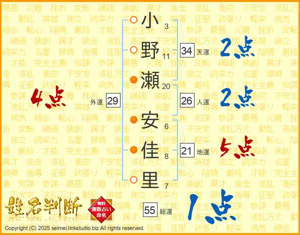 小(3画)野(11画)瀬(20画) 安(6画)佳(8画)里(7画)