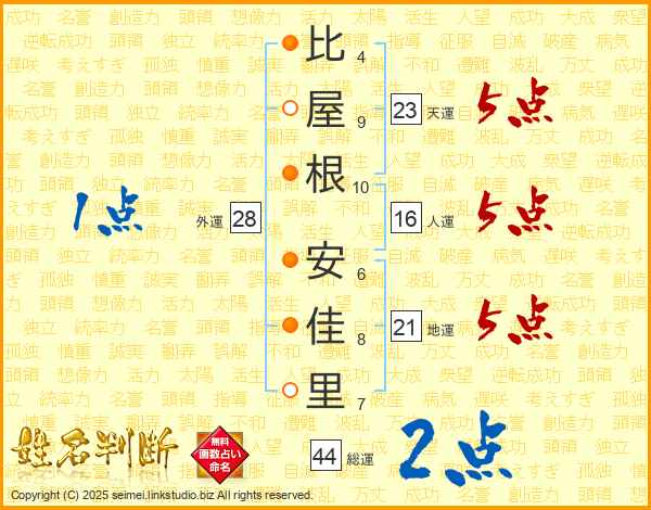 比(4画)屋(9画)根(10画) 安(6画)佳(8画)里(7画)