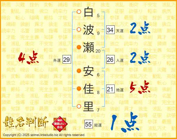 白(5画)波(9画)瀬(20画) 安(6画)佳(8画)里(7画)