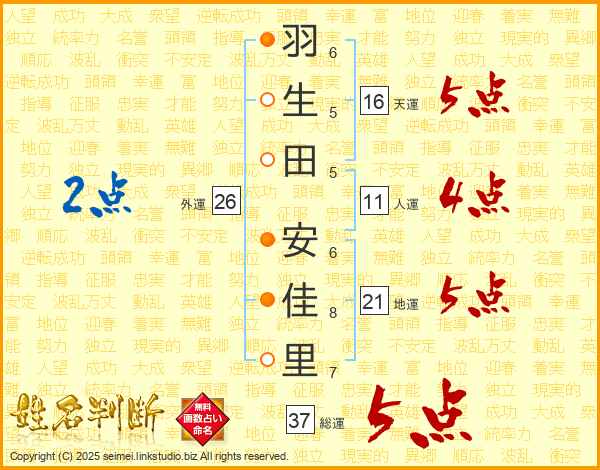 羽(6画)生(5画)田(5画) 安(6画)佳(8画)里(7画)