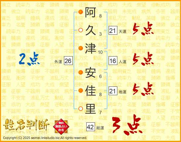 阿(8画)久(3画)津(10画) 安(6画)佳(8画)里(7画)