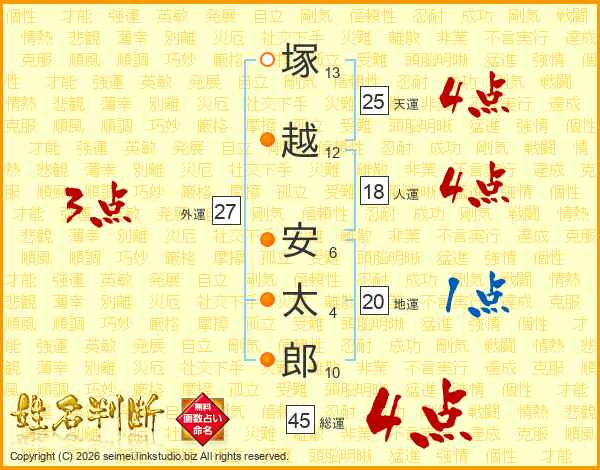 塚(13画)越(12画) 安(6画)太(4画)郎(10画)