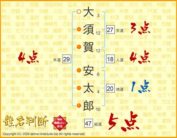 大(3画)須(12画)賀(12画) 安(6画)太(4画)郎(10画)