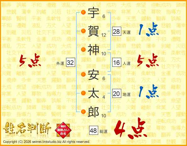 宇(6画)賀(12画)神(10画) 安(6画)太(4画)郎(10画)